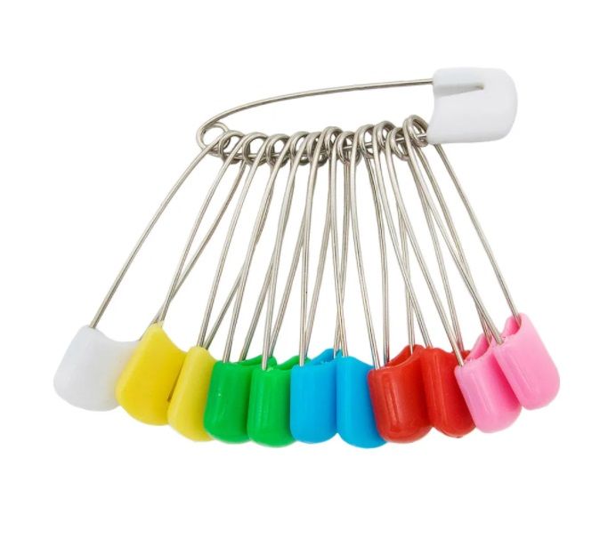 Английские булавки с замком безопасности изготовлены из стали и пластика. С защитой от западания нити. У булавки имеется пластиковый наконечник, что делает ее использование безопасным для детей.