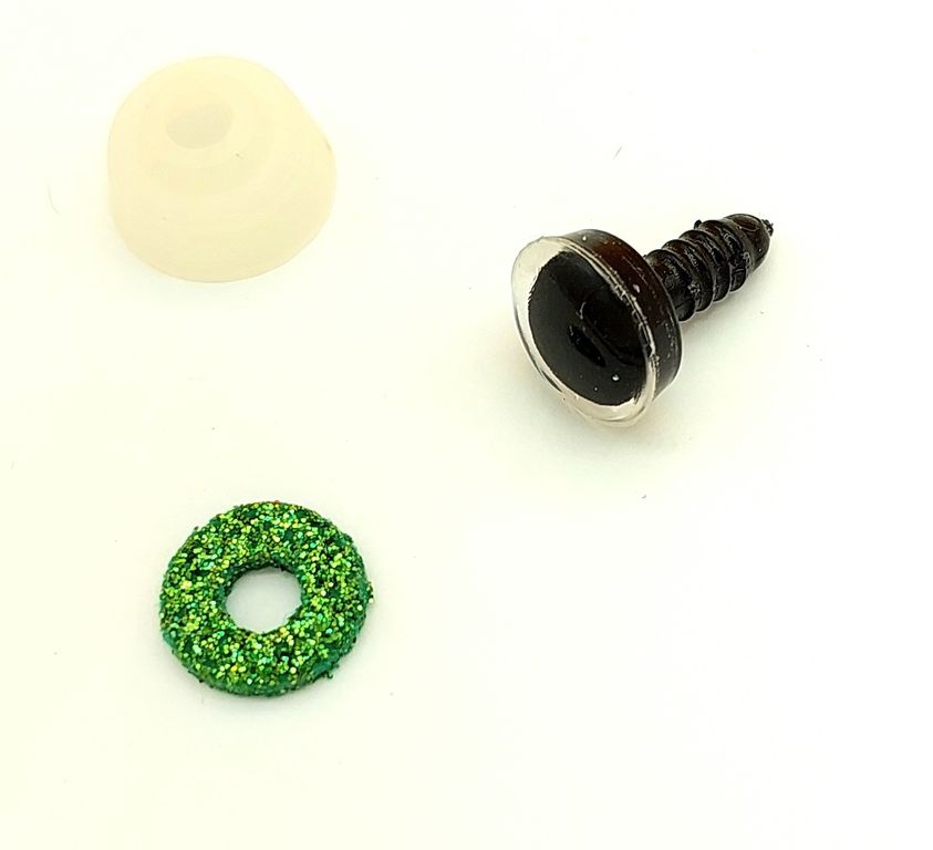Сферическая черная не прозрачная пластиковая середина и прозрачное основание с блестящей подложной (4 различных цвета- фуксия, зеленый, золотой, голубой). Основание сделано так, чтобы можно было «утопить» изделие непосредственно в игрушку для более натурального эффекта
